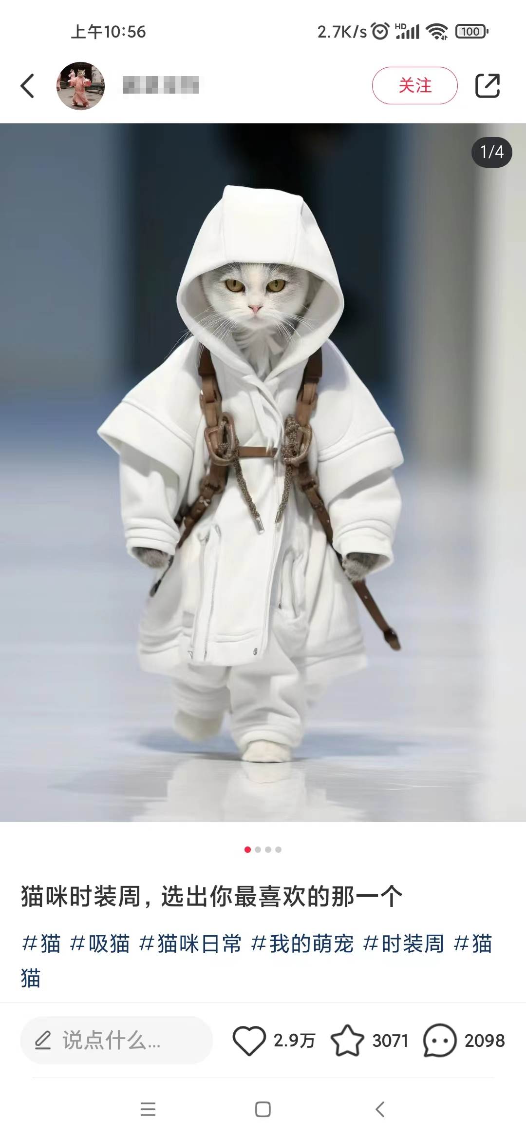 小红书最新爆款项目,Animal秀,7天变现1w+Animal秀在小红书上是非常爆款的项目,动不动就几万的赞,笔记的内容主要是猫咪走秀搭配一段文案,就是一只猫穿着人类的衣服在走T台,看起来非常的新奇特,加上小红书的主要用户群体是女性用户,女大学生,少女,宝妈这类,而大部分女性都是比较喜欢猫咪这类动物,加上我们的猫咪图片非常的可爱或者酷帅,很难不爱。我从小红书上截了一些图给大家看下:
